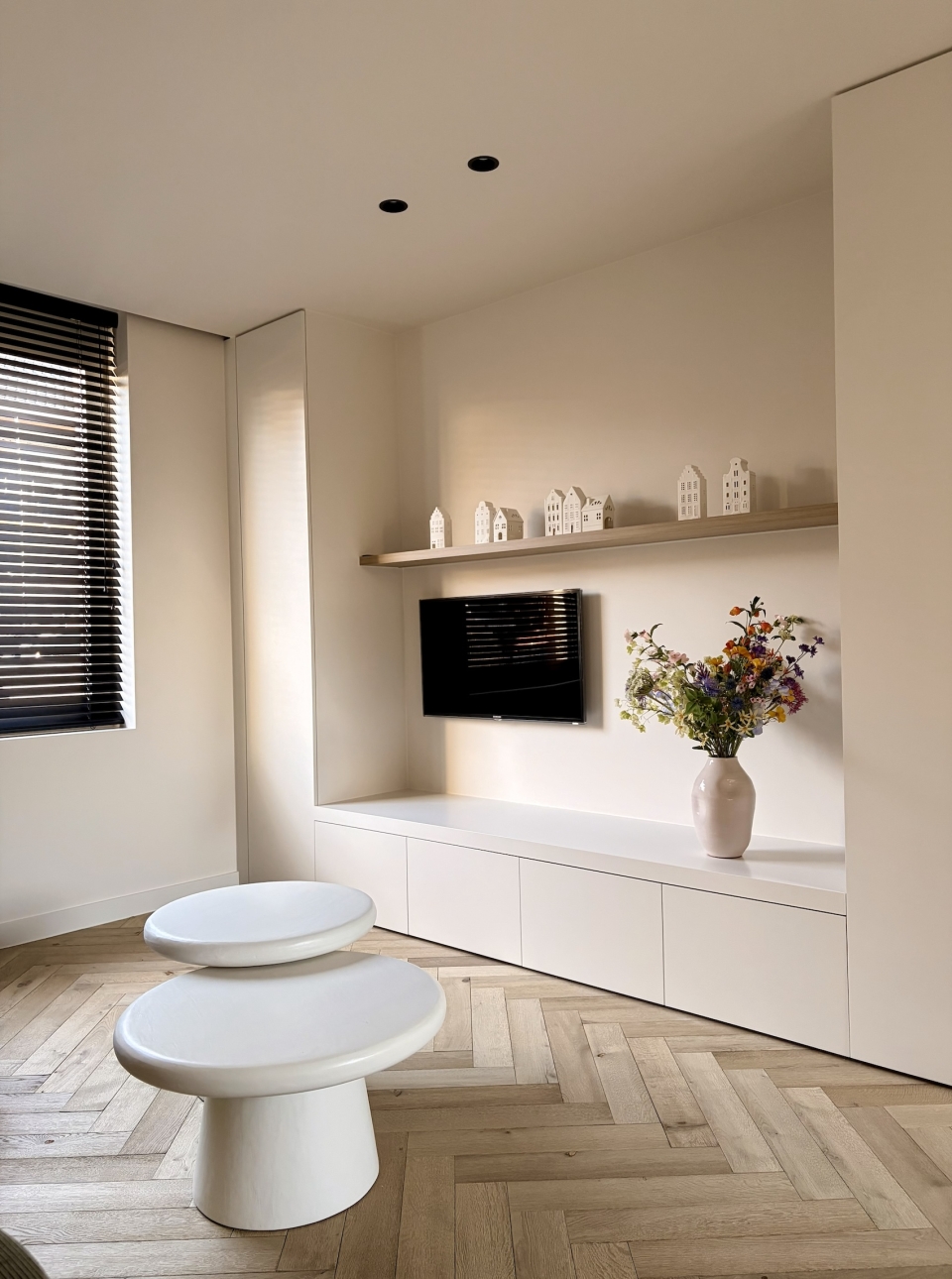 Het tv-meubel werd uitgewerkt als een strak, ingebouwd volume dat aansluit bij de architectuur van de ruimte. Door het vaste meubilair bewust terug te brengen tot zijn essentie blijft de leefruimte open, helder en in balans.